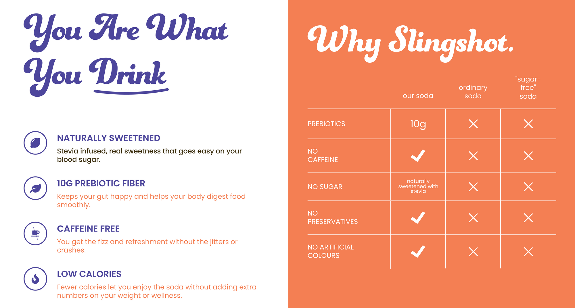 Slingshot is a Prebiotic soda with zero added sugar, designed to support gut health while tasting ridiculously good. It’s fizzy, refreshing, and made for everyday sipping.